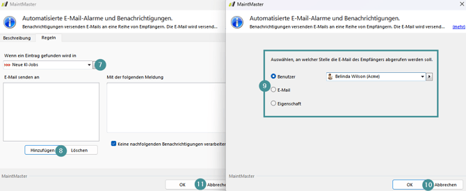 9. Geben Sie an, wer die Benachrichtigung/den Alarm erhalten soll und wie das System die Kontaktinformationen auswählt.