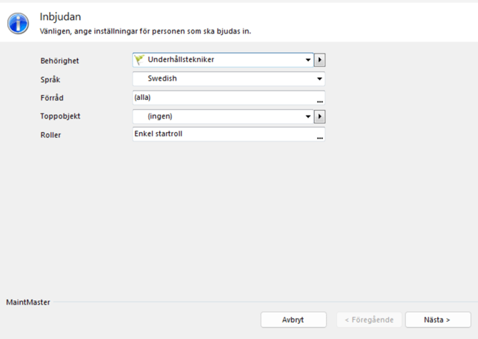 2. Välj behörighet och roll(er) samt, eventuellt, språk, förråd och toppobjekt.